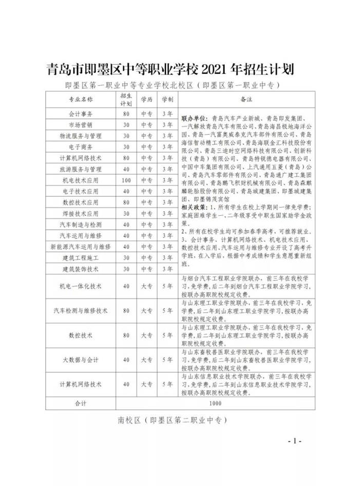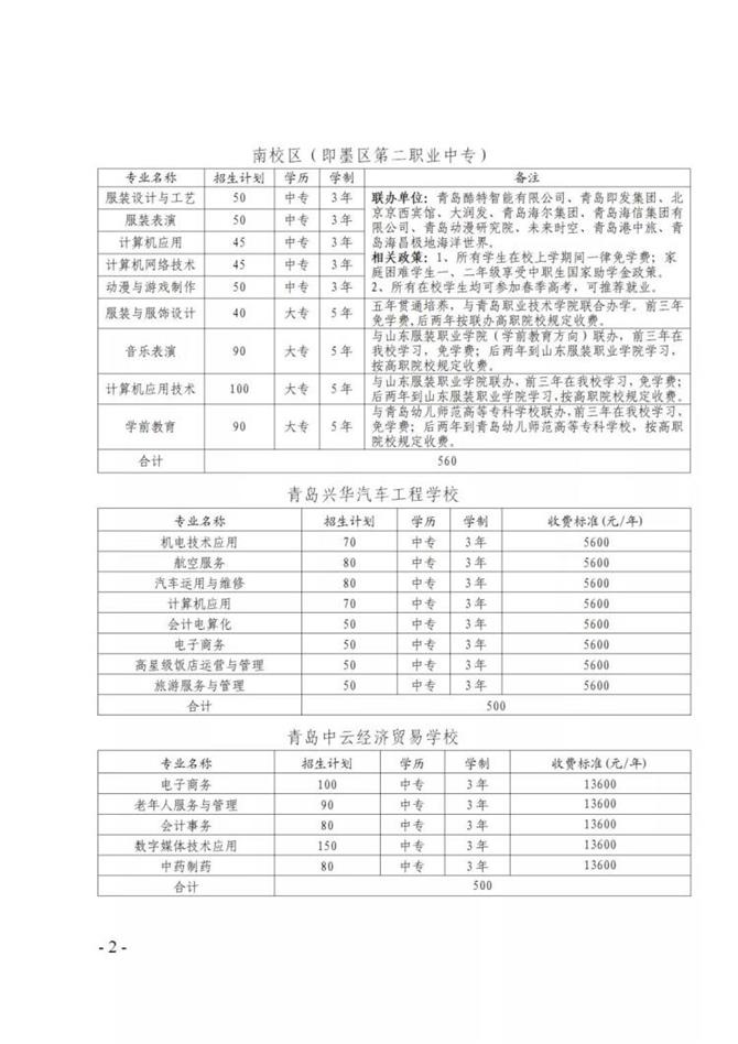 我區(qū)第一職業(yè)中等專業(yè)學校(北校區(qū)、南校區(qū))計劃招生1560人,其中中專生960人、五年制高職生600人。民辦職業(yè)學校青島興華汽車工程學校計劃招收中專生500人,民辦職業(yè)學校青島中云經(jīng)濟貿(mào)易學校計劃招收中專生500人(具體招生計劃見附件1)。
