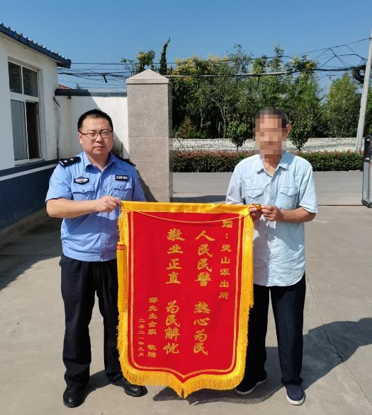 9月15日下午,即墨鄒先生趕到靈山派出所,將一面“人民民警 熱心為民”的錦旗送到了民警手中,對暖心助人的民警表達感激之情。