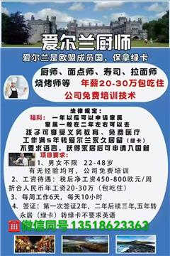 愛爾蘭廚師,面點(diǎn)師,拉面師招聘,包吃住,不要求英語,詳情見圖片,絕對(duì)好單,正規(guī)工簽