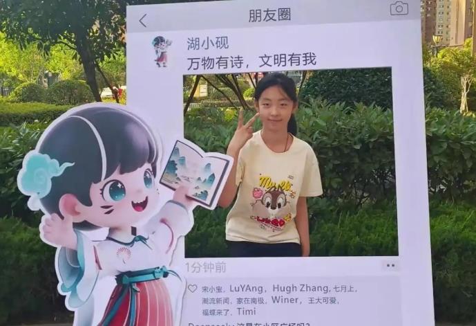 “硯硯子,看這里!”孩子們爭(zhēng)相與她合影,而這位“00后國(guó)風(fēng)少女”早已不僅是卡通形象——她是社區(qū)的新晉“頂流”,是居民群里的表情包霸主,更是濱湖社區(qū)“書(shū)香共享、文明共育”理念的鮮活代言人。