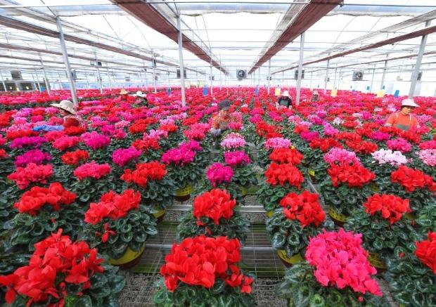 1月25日,花農(nóng)在青島市即墨區(qū)靈山花卉文化產(chǎn)業(yè)園管護(hù)花卉。 春節(jié)臨近,山東省青島市即墨區(qū)靈山花卉文化產(chǎn)業(yè)園的年宵花迎來(lái)生產(chǎn)和銷售旺季,花卉大棚內(nèi)的蝴蝶蘭、長(zhǎng)壽花、仙客來(lái)等競(jìng)相綻放,花農(nóng)們按照訂單外運(yùn)各類花卉,供應(yīng)節(jié)日市場(chǎng)。