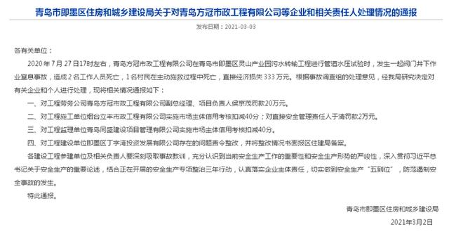 3月3日,青島市即墨區(qū)住房和城鄉(xiāng)建設(shè)局發(fā)布于對(duì)青島方冠市政工程有限公司等企業(yè)和相關(guān)責(zé)任人處理情況的通報(bào)。通報(bào)稱,2020 年 7 月 27 日17時(shí)左右,青島方冠市政工程有限公司在青島市即墨區(qū)靈山產(chǎn)業(yè)園污水轉(zhuǎn)輸工程進(jìn)行管道水壓試驗(yàn)時(shí),發(fā)生一起閥門井下作業(yè)窒息事故,造成 2 名工作人員死亡,1 名村民在主動(dòng)施救過程中死亡,直接經(jīng)濟(jì)損失 333 萬元。根據(jù)事故調(diào)查組的處理意見,經(jīng)我局研究決定對(duì)有關(guān)企業(yè)和個(gè)人進(jìn)行處理,現(xiàn)將相關(guān)情況通報(bào)如下: