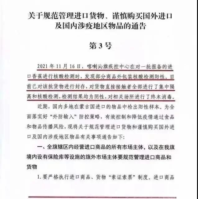 目前已對該批貨物進行封存,對貨物直接接觸者全部集中隔離和核酸檢測,檢測結果均為陰性,對相關場所進行了終末消毒。