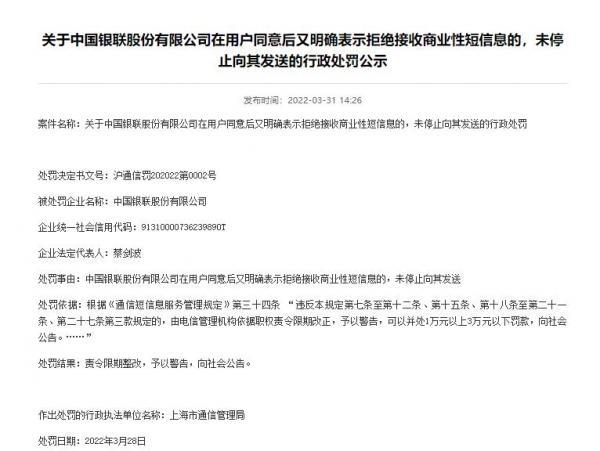 一條垃圾短信似乎危害不大,但長此以往默認(rèn)就變成了縱容。針對多次收到商業(yè)短信的情況,賈先生在向行業(yè)主管投訴的同時,還已于今年1月向中國銀聯(lián)注冊地的人民法院提起訴訟。2022年3月,上海市通信管理局在其官網(wǎng)公開了一份行政處罰公告,中國銀聯(lián)因“在用戶同意后又明確表示拒絕接收商業(yè)性短信息的,未停止向其發(fā)送”,被責(zé)令限期整改,予以警告。