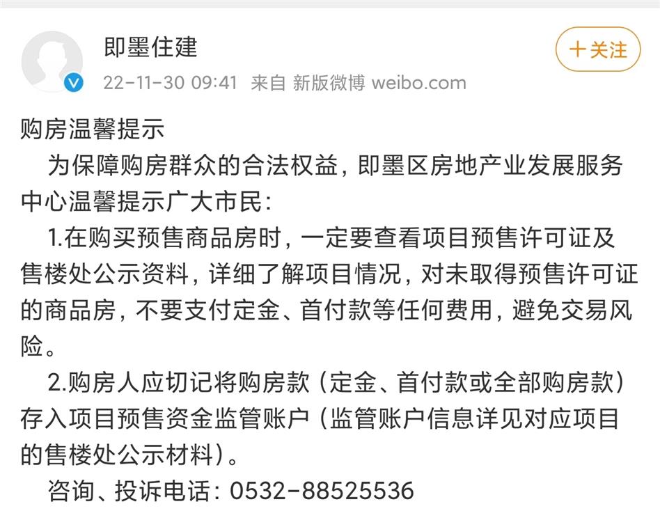 11月30日,即墨住建局在官方微博發(fā)布購房溫馨提示! 為保障購房群眾的合法權(quán)益,即墨區(qū)房地產(chǎn)業(yè)發(fā)展服務(wù)中心溫馨提示廣大市民: