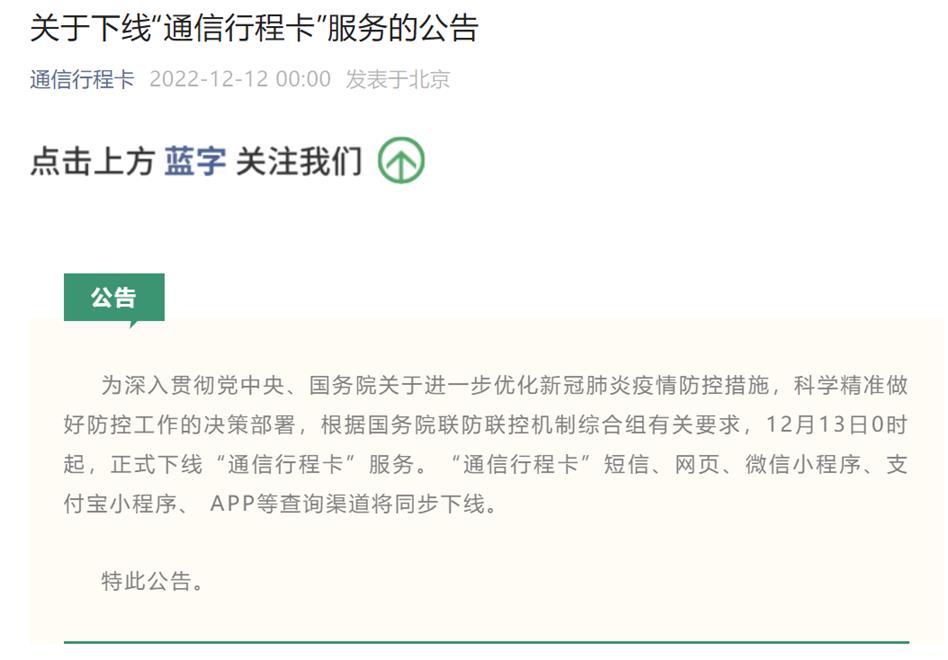 ↓↓↓ 為深入貫徹黨中央、國務院關于進一步優(yōu)化新冠肺炎疫情防控措施,科學精準做好防控工作的決策部署,根據(jù)國務院聯(lián)防聯(lián)控機制綜合組有關要求,12月13日0時起,正式下線“通信行程卡”服務。“通信行程卡”短信、網(wǎng)頁、微信小程序、支付寶小程序、 APP等查詢渠道將同步下線。
