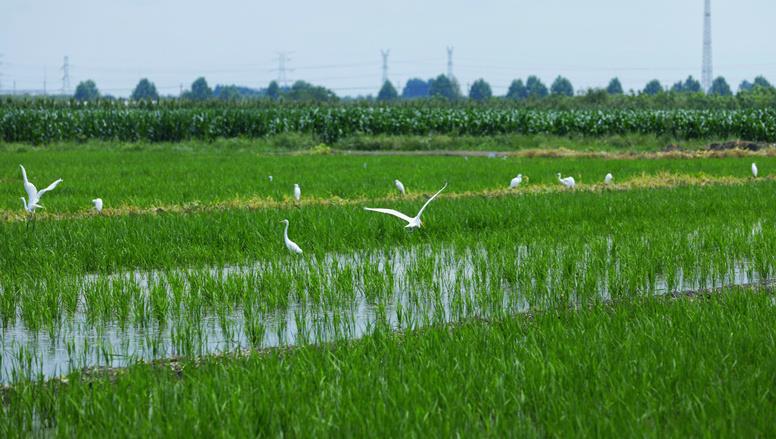 連片優(yōu)質(zhì)水稻田里,數(shù)十只白鷺時(shí)而振翅起飛,時(shí)而穿梭稻田覓食,時(shí)而漫步田埂,成為綠色稻田里的亮麗風(fēng)景線。