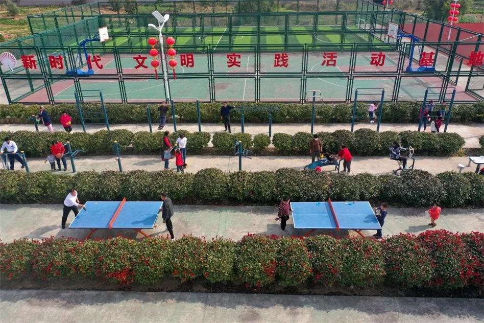 即墨區(qū)龍山街道前東葛村村民在打乒乓球(無人機(jī)照片)。