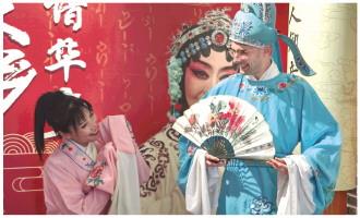 在即墨區(qū)柳腔博物館,講解員向Julian Millidge介紹了柳腔的起源與發(fā)展。在柳腔老師的帶領(lǐng)下,Julian Millidge打扮成小生扮相,沉浸式學(xué)習(xí)柳腔表演的形體動作和經(jīng)典唱段。柳腔起源于即墨大沽河流域,距今已有200多年的歷史,因其表演清新質(zhì)樸、風(fēng)趣生動,被譽為“膠東之花”,是國家級非物質(zhì)文化遺產(chǎn)。