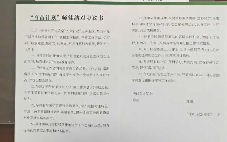 采取師徒結(jié)對的方式,從“班子成員帶年輕中層”“中層帶年輕干部”“包村干部幫帶”三個層面,采取“一對一”“一對多”“多對一”相結(jié)合的方式開展“導(dǎo)師幫帶雁陣”行動,在現(xiàn)場簽訂《“育苗計劃”師徒結(jié)對協(xié)議》。