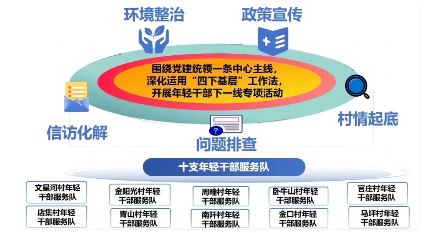 通過構(gòu)建“1·5·10”組織架構(gòu)體系,確保專項行動順利開展。其中“1”是指堅持黨建統(tǒng)領(lǐng)一條主線,深化運用“四下基層”工作法,成立鎮(zhèn)黨委專項行動指揮部,統(tǒng)籌抓好鎮(zhèn)域內(nèi)各項重點工作任務(wù)落實;“5”是指成立“政策宣傳”“村情起底”“問題排查”“信訪化解”“環(huán)境整治”5個工作推進專班,明確分工,各司其職;“10”是指對應(yīng)10個新村建立10支“年輕干部服務(wù)隊”,下沉所有自然村,每支隊伍明確帶隊領(lǐng)導(dǎo),配備副隊長和聯(lián)絡(luò)員,各包村年輕干部根據(jù)專班下發(fā)的任務(wù)及《包村干部職責(zé)》開展下沉工作。