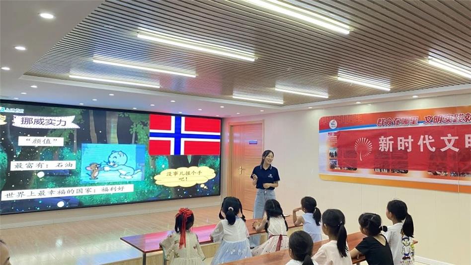 在課程中,劉老師首先通過提問的方式,吸引孩子們對故事內(nèi)容的興趣,接著詳細(xì)介紹了故事作者的生平、風(fēng)格及代表作,并對作者的家鄉(xiāng)挪威和故事的主角鴨子的相關(guān)信息進行了拓展延伸,最后在老師的引領(lǐng)下,孩子們對故事內(nèi)容有了更深入的理解。