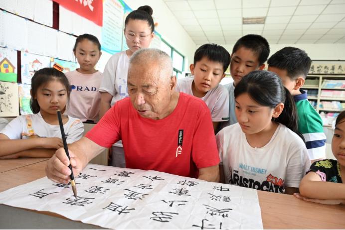 “我們學習的是撇、點、捺……”7月16日,在山東省青島市即墨區(qū)龍山街道西程哥莊村的暑假公益托管班上,90歲的江敦仁正耐心地指導小學生寫毛筆字。還有20多名小朋友都在認真地學習毛筆字。今年已經(jīng)是江敦仁從中學校長的崗位退休后的第20年在暑假公益托管班教孩子們學習書法。