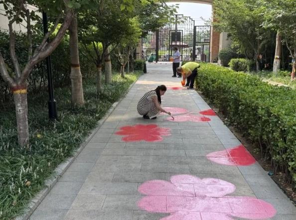 居民執(zhí)筆,共繪社區(qū)溫情。許多家庭早早來到現(xiàn)場,孩子們用稚嫩的手掌蘸取環(huán)保涂料,小心翼翼地為斑馬線添上愛心;年輕人俯身勾勒輪廓,夫妻搭檔默契填色……原本單調(diào)的灰白斑馬線逐漸被暖粉、亮紅色的愛心圖案覆蓋。一位參與繪制的居民笑著說:“第一次為社區(qū)‘畫畫',感覺這條路由我親手變浪漫了!”浪漫升級,斑馬線成鄰里社交新窗口;顒咏Y(jié)束后,原本普通的道路瞬間變身“網(wǎng)紅景點”。居民們駐足拍照,孩子們在地面愛心上蹦跳,老年夫婦在地面愛心上攜手漫步,現(xiàn)場一派和諧浪漫。