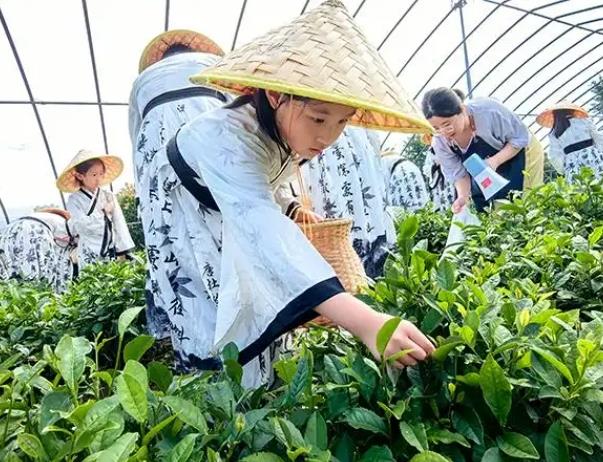 當(dāng)講解環(huán)節(jié)結(jié)束,孩子們挎起精巧的竹編茶簍,即刻化身“小小茶農(nóng)”。他們穿梭在錯(cuò)落的茶壟間,漢服的水墨紋樣與翠綠茶芽相映成趣,竹笠的編織紋路在陽光下泛著質(zhì)樸光澤。彎腰、提指、采摘,一系列動(dòng)作雖稍顯生疏,卻滿是認(rèn)真。有的孩子還互相交流采摘心得,“你看這芽頭多飽滿”“原來采茶要這么輕才不會(huì)傷了茶樹”,田園間的歡聲笑語與茶葉的清香交織成獨(dú)特的研學(xué)樂章。
